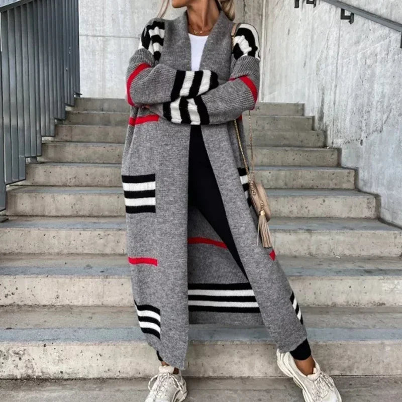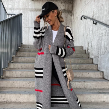 Jeg er begejstret for denne cardigan! Kombinationen af striber er dristig og unik. Den tiltrækker komplimenter, uanset hvor jeg går.