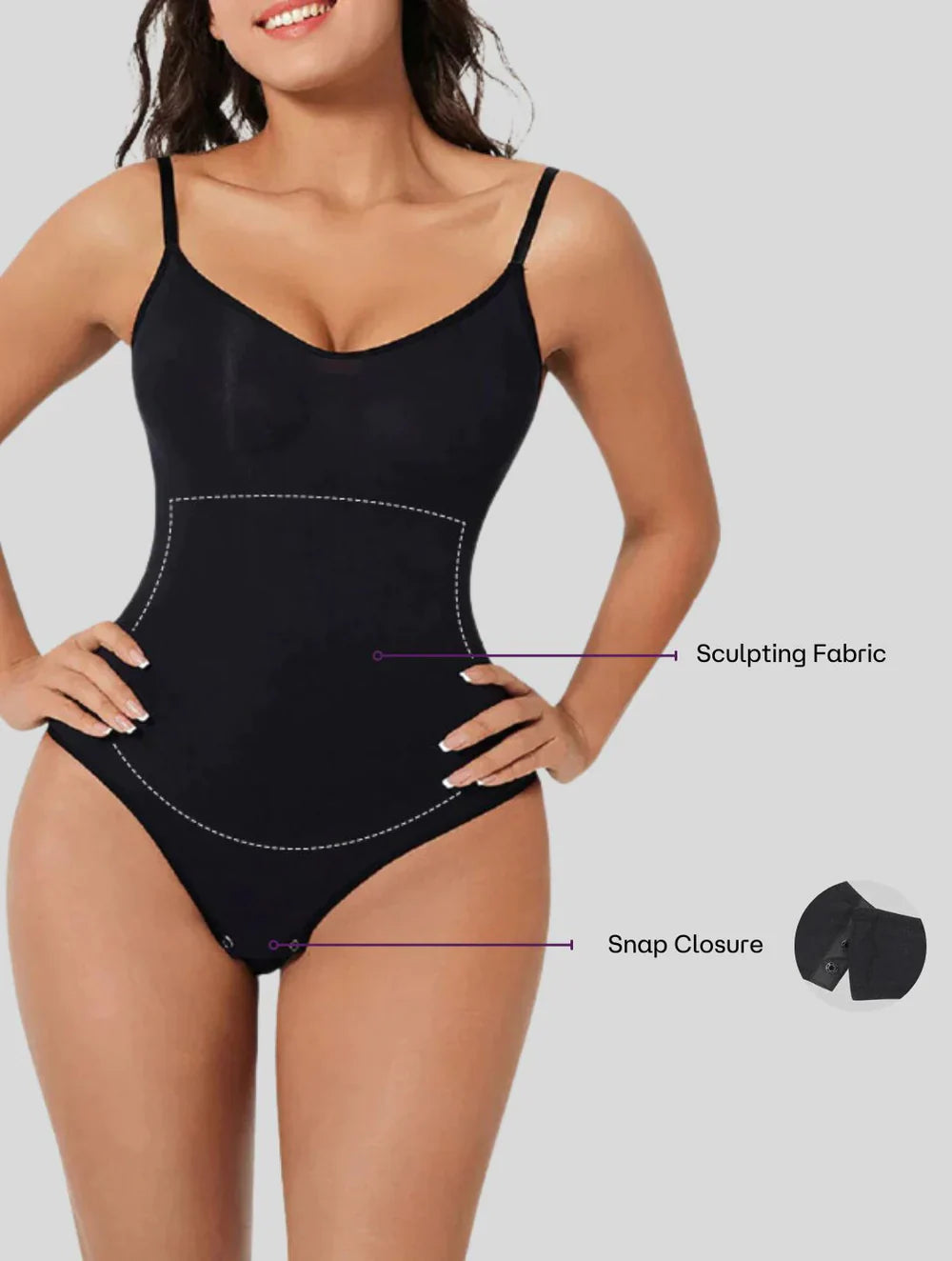 Vores SculptShape Shapewear-dragt er fremstillet af materialer af højeste kvalitet, som forhindrer hudirritation og sikrer optimal komfort, når den bæres.