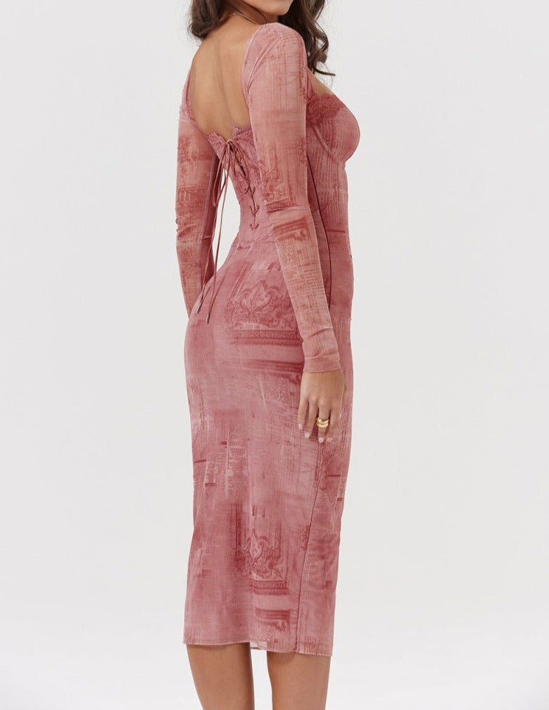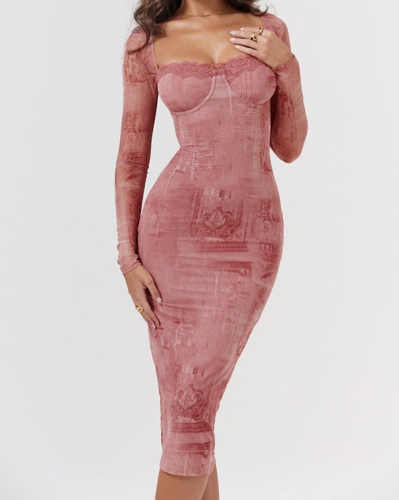 Den perfekte kjole til efteråret i et smukt pink print. Den er skåret i blødt stretchstrik, der smyger sig smukt om dine kurver, og har bøjle i skålene og indvendige støttebøjler, der strammer taljen ind.